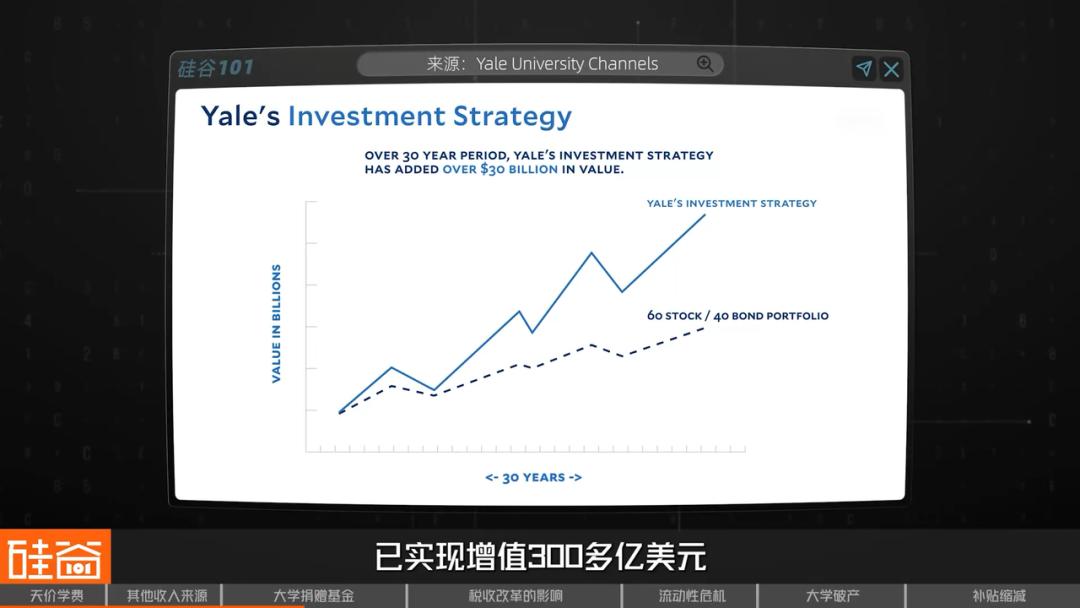 在过去30年间,相比于被动的“60%股票、40%债券”的配置策略,耶鲁的投资策略带来了超过300亿美元的收益。