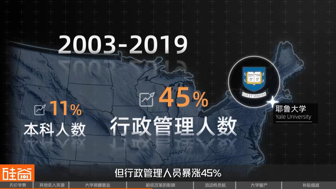 数据显示,耶鲁在2003-2019年间本科生人数几乎没变(仅增长约11%),但行政管理人员暴涨45%,尤其在2018年时,耶鲁是常春藤中管理人员最密集的学校,全美私立大学中排名第五。