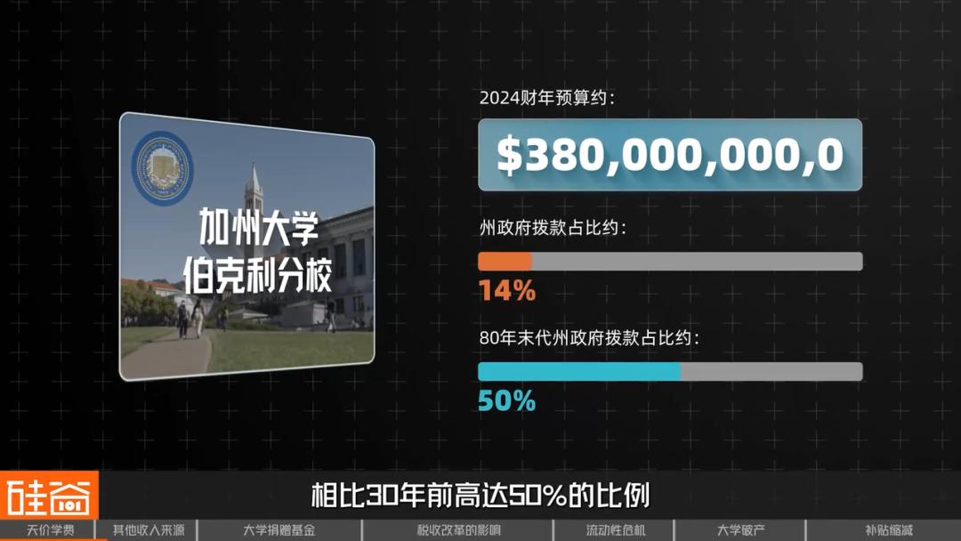 以加州大学伯克利分校为例:2024财年里,这所顶尖公立学府的预算高达38亿美元,但州政府拨款只占了其中的14%。相比三十年前高达50%的比例,州政府对公立高等教育的支持已经大幅缩水。