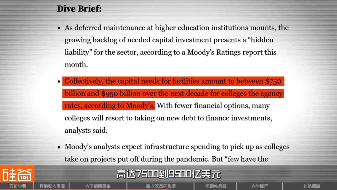 最后,美国大学几乎年年修建宿舍、体育馆等设施,建设和维修都需要花费。比如哈佛2024年投入6亿美元在基建上,而评级机构Moody's预计,美国高校在未来十年中基础设施方面的“延后维护需求”高达7500-9500亿美元。