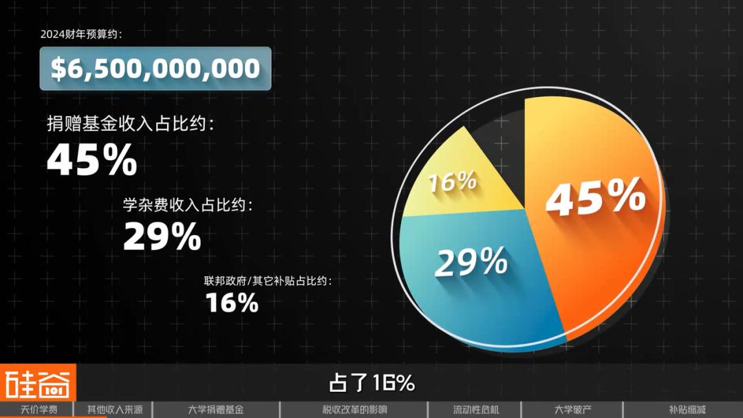 2024财年,哈佛大学的总收入为65亿美元。这其中,捐赠基金收入占了45%,剩下的学费收入占了29%,联邦政府及其他非政府的研究补贴占16%。