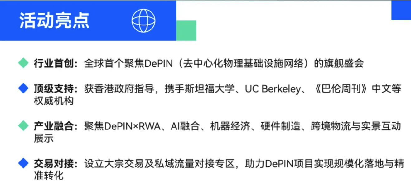 展会现场,还将设置“DePIN城市示范区”,以香港为原型,展示链上硬件在城市级别的部署、运行与结算路径。这是 Web3 历史上首次以城市为单位进行 DePIN 展示,意味着 DePIN 正从“硬件实验室”迈向“基础设施平台”。