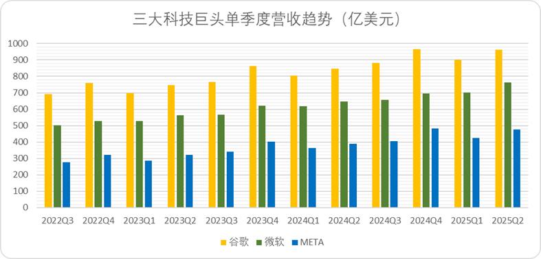 图:谷歌、微软、Meta单季度营收趋势,来源:Choice金融客户端,企业财报