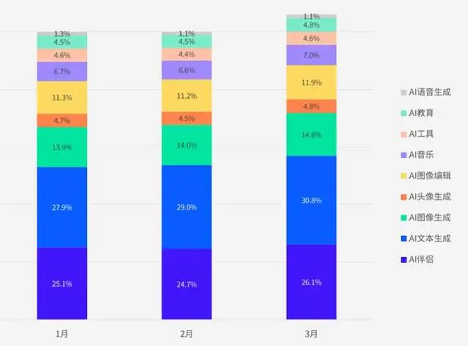 以Appgrowing发布的报告来看,今年第一个季度,海外AI应用的投放增长明显,仅以3月为例,环比增速达到了5%,细分品类来看,绝大多数增速都不错,AI伴侣、文本生成、AI教育的投放数量也明显增长。