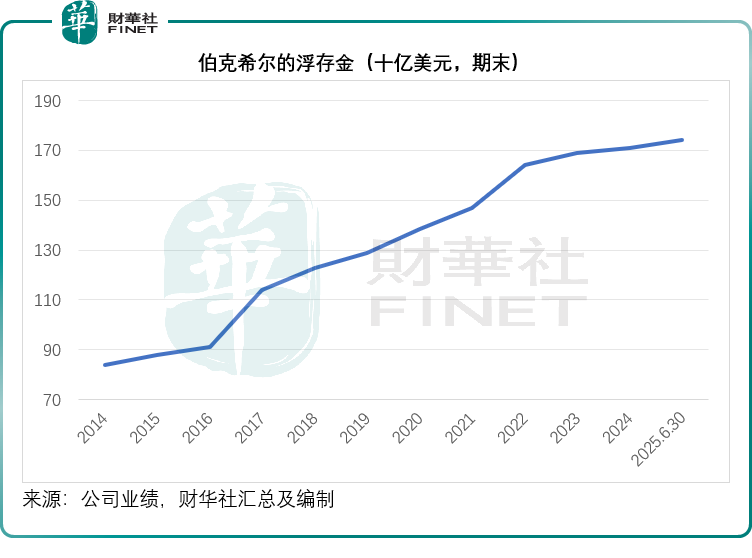 2025年6月末,伯克希尔的浮存金由2024年末的1,710亿美元进一步扩大至1,740亿美元,见下图。