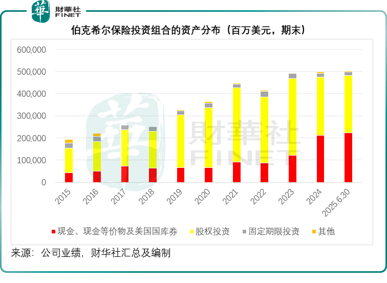 即便能用来投资的资金多了,伯克希尔仍继续抛售股票套现。从其保险投资组合来看,2025年6月末,股权投资从2024年末的2,633.66亿美元,下降至2,607.48亿美元,于保险投资组合的占比由52.98%下降至51.87%。现金持仓则进一步增加,由2024年末的2,125.91亿美元,增至2,219.99亿美元,占比由42.77%上升至44.16%。