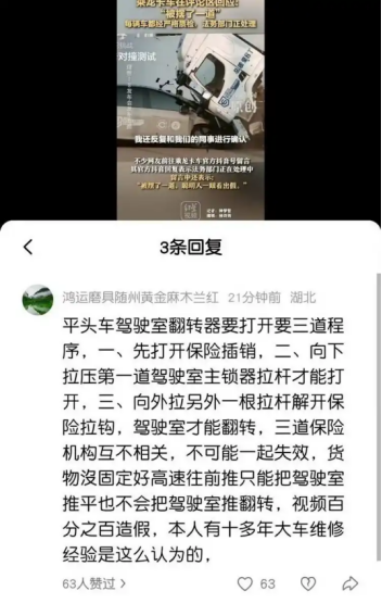 在一条两车对撞测试视频的评论区,一位自称有十余年大车维修经验的用户称,平头车驾驶室翻转器要三道程序才能打开,三道保险机构互不相关,不可能一起失效。