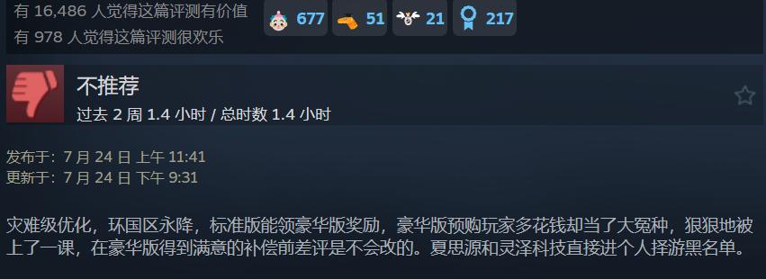 尤其是在社交舆论环境走向极化的现在,一款游戏从“封神”到“塌房”或许只要一瞬间。要知道,近几年来全球游戏界最具标志性的“差评”事件里,不少都和中国玩家紧密相关,“Steam差评榜榜首”更是一度成为中国玩家的常驻战场。