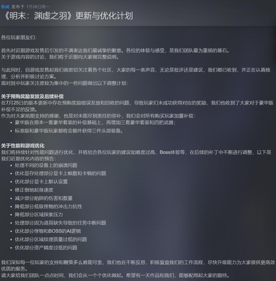 发售后的头5天里,《明末:渊虚之羽》在Steam平台连发了足足4条公告,千言万语汇成“认错改正”几个大字。