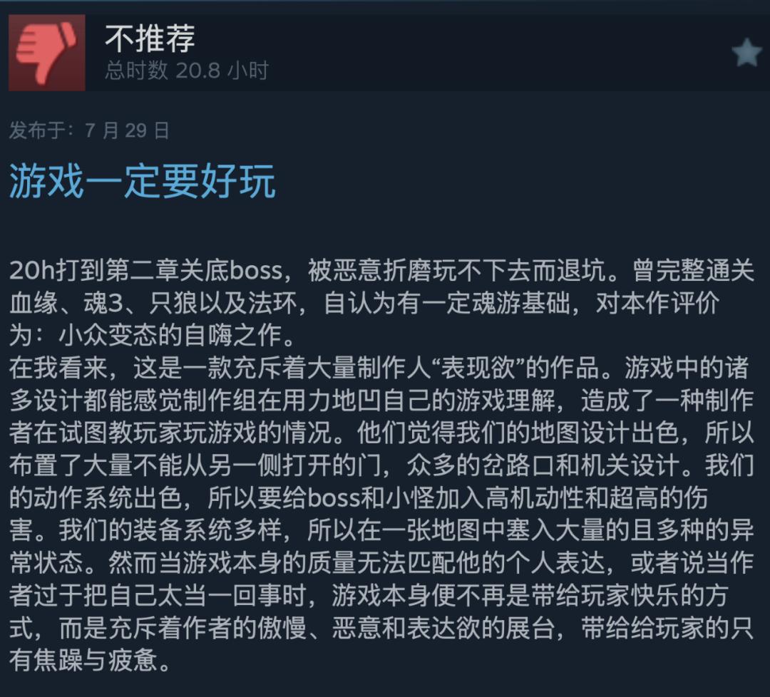 打开Steam平台的评测区,用户共鸣最多的几篇差评几乎都提到了游戏里的满满“恶意”。过去,这个词主要被用在以宫崎英高为代表的明星创作者身上,意在描述魂类游戏中那些让玩家眼前一黑的场景设计、险恶陷阱等,是魂类玩家最核心的社区“梗”源头。