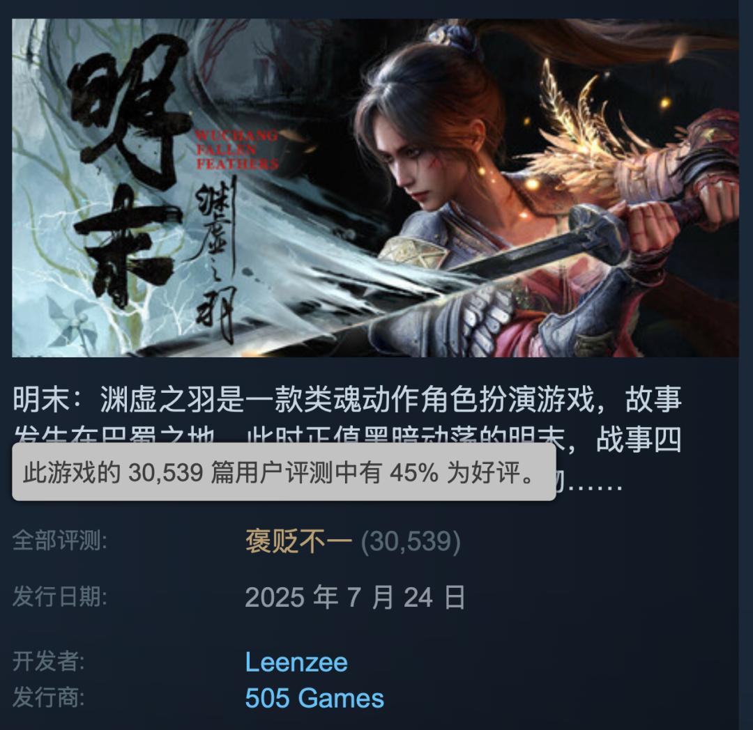 这款出自灵泽科技之手、由505 Games发行的中式魂类ARPG大作,如同坐过山车一般迎接了它面世又碰壁的命运。从7月24日紧急表态的首日道歉信,到7月28日再度致歉的更新计划公告,《明末:渊虚之羽》花了将近一周时间,才堪堪把发售之初低至20%的Steam好评率拉回到40%以上。