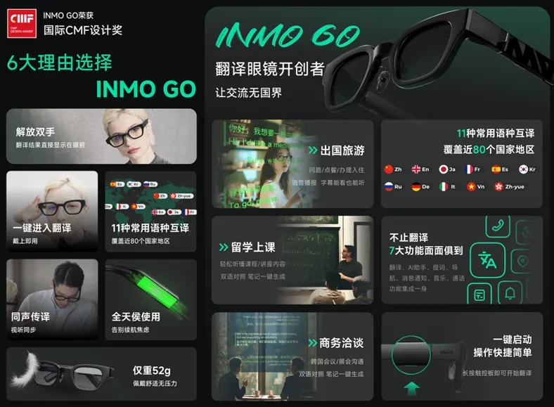 影目科技成立于2016年,专注于AR眼镜等智能硬件产品的研发与销售,是国内领先的智能眼镜厂商。影目科技构建了“硬件+内容+渠道”一体化生态,联合腾讯应用宝打造内容平台,并与中国移动展开渠道与技术合作,推动产品广泛落地。根据维深信息(Vsen Data)数据显示,2023年公司市场份额达41%,连续三年位居国内智能眼镜出货量首位。其产品覆盖办公、娱乐、资讯等全场景应用,其中INMO AIR3定位为多场景通用终端,INMO GO2则聚焦商务出行,支持多语言离线翻译,2025年一季度INMO GO系列订单已突破10万台。