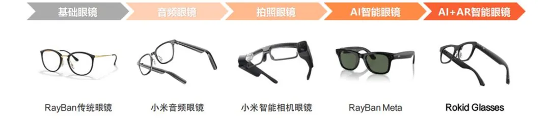 AI智能交互阶段(2022至今):智能眼镜通过集成AI技术,提供更加智能和个性化的交互体验,同时竞争更加激烈。2023年Meta推出具备Meta AI搭载摄像头交互功能的Ray-Ban Meta2,截至2024年底销量累计超过200万台。2024年-2025年,Rokid、雷鸟等AR厂商,大朋等VR厂商,苹果、三星、谷歌、华为、百度、天猫等AI生态厂商等厂商纷纷入局,行业发展进入快车道。