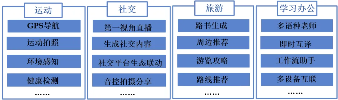 旅游:Citywalk、露营、一日游这类轻型旅游受年轻人青睐,AI交互眼镜结合景区数据,依靠多模态大模型与LBS技术打造精准智能语音导览服务。其数据涵盖核心景区、小众特色景点及当地美食等内容,具备路书生成、周边推荐等核心功能,能为游客提供景区游玩导览、动态巡航模式、地点弹幕等服务,可自动生成路线和游记,为游客带来优质的旅游体验。