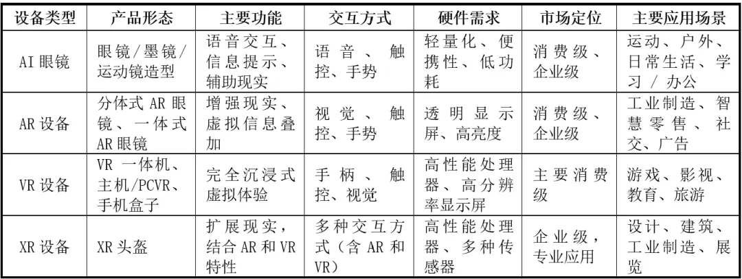 表1:AI智能交互眼镜/AR/VR/XR特征对比
