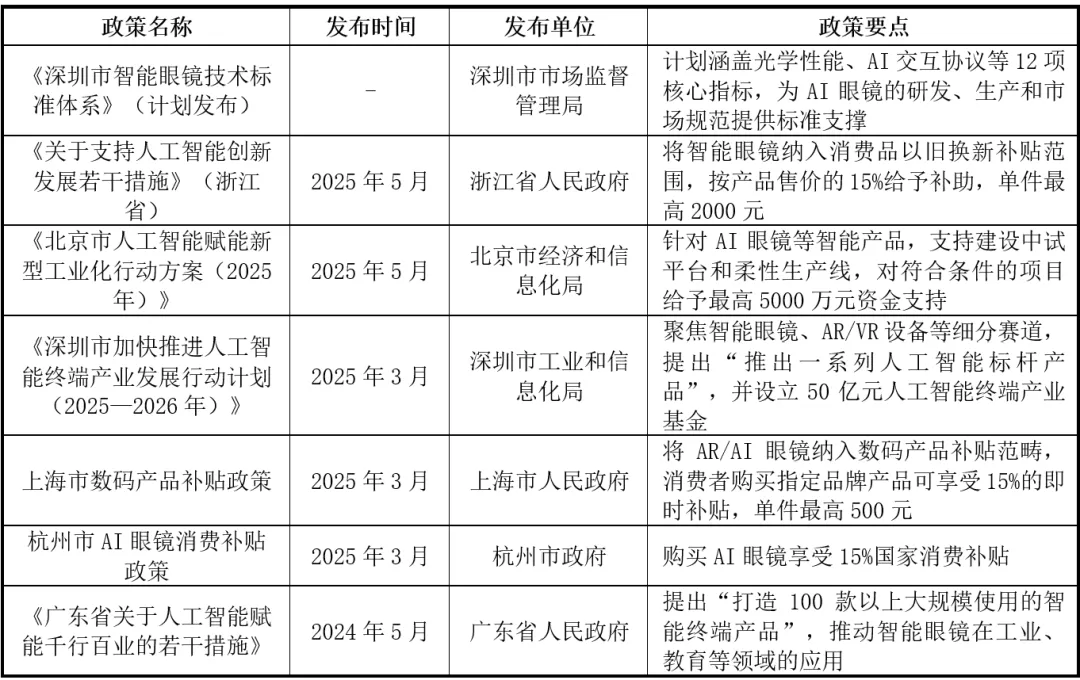 近几年,中国陆续出台针对AI眼镜产业的支持性政策,国家层面侧重顶层设计与核心技术突破,如建立AI终端标准化体系引领核心技术突破,重点支持在工业、医疗等领域应用;地方层面聚焦产业落地与市场培育,如深圳50亿产业基金、北京生产线补贴、广东打造智能终端产业集群。