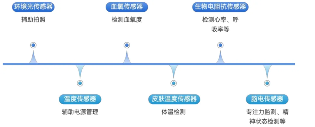 传感器:现阶段的传感器主要有环境光传感器、温度传感器等,未来将添加更多的传感器,如血氧传感器,用于计算血氧度;生物电阻抗传感器,检测心率、呼吸率和皮电反应指数;皮肤温度传感器,用于检测体温;脑电传感器,用于监测或控制人的大脑活动,用于专注力监测、精神状态见监测等等。