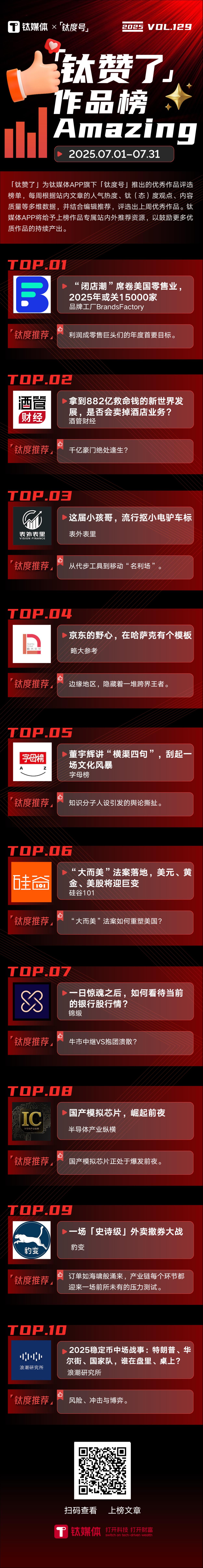 2025年7月1日—2025年7月31日,「钛赞了」榜单第129期上榜作品为: