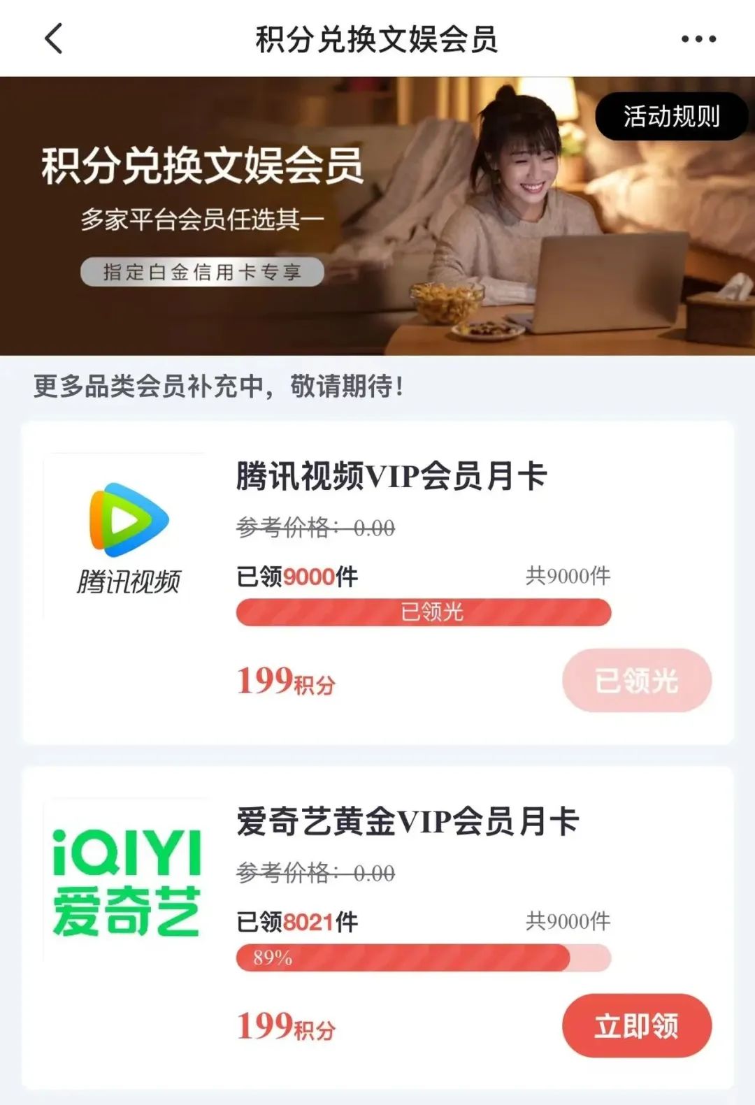 比如,招行鸟白信用卡,兑换文娱月会员要199积分,包含QQ音乐、爱奇艺、腾讯视频等平台,想要攒够兑换积分,至少需要消费4000元。