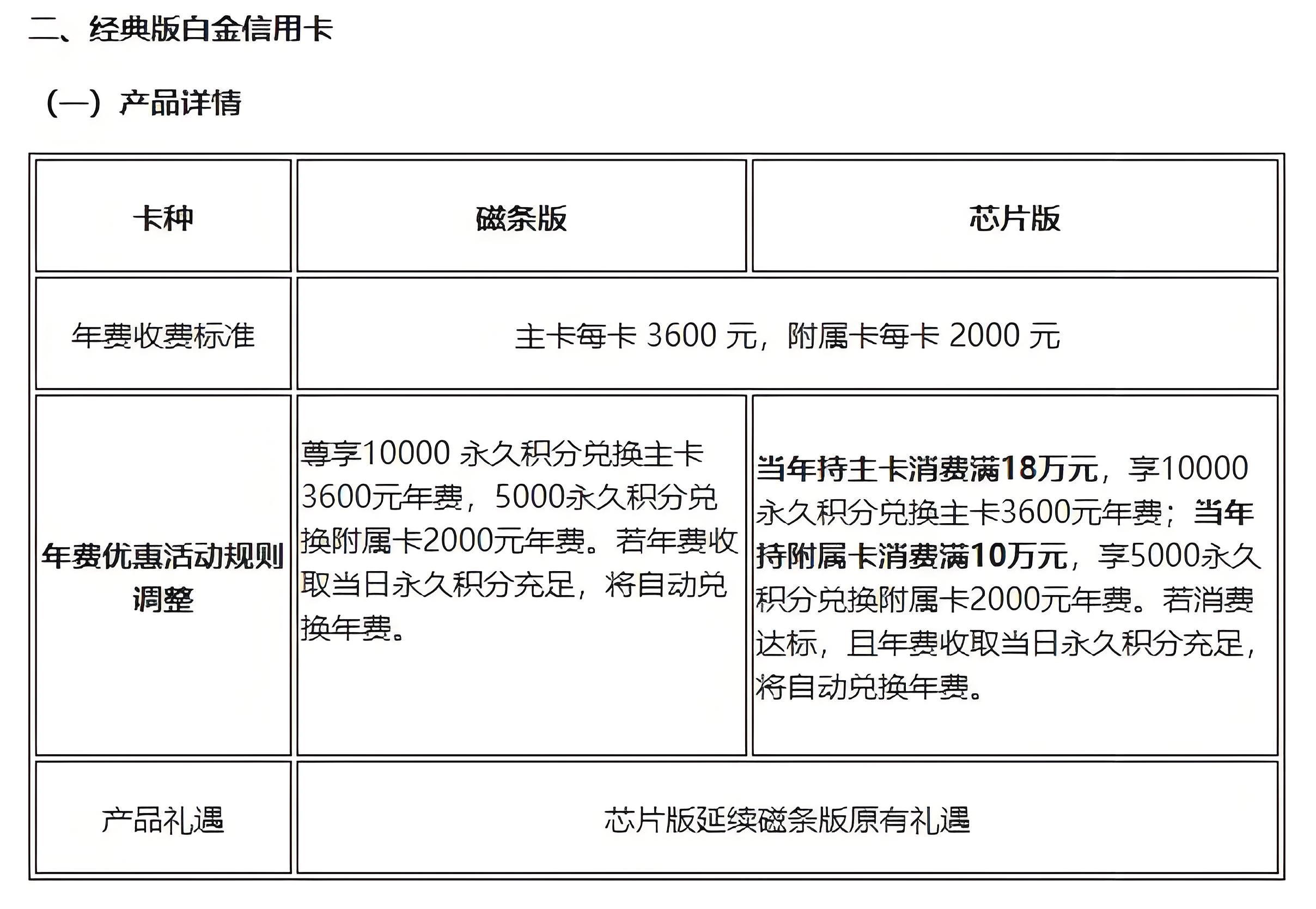 其中,芯片卡主卡年消费18万元,可用1万积分抵扣3600元年费;附属卡年消费10万元,可用5000积分抵扣2000元年费。