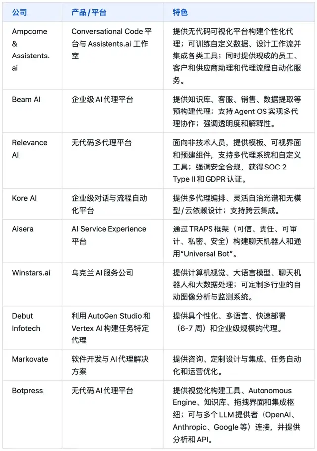 有定制需求的企业可与Ampcome、Relevance AI、Beam AI、Botpress等公司合作,根据自身流程和数据训练专用代理;