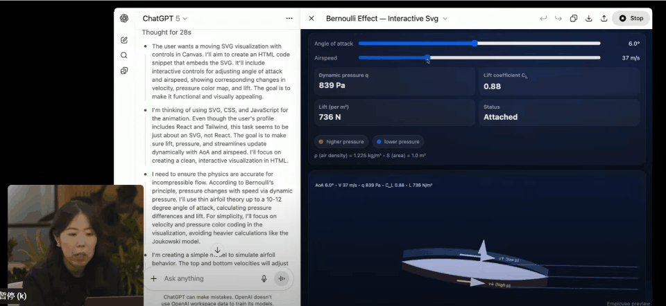孩子让你给他解释流体力学中的伯努利公式,以前的AI可能给你一篇文章,GPT-5能按照你的要求,一句话直接给你做一个可以互动的页面。