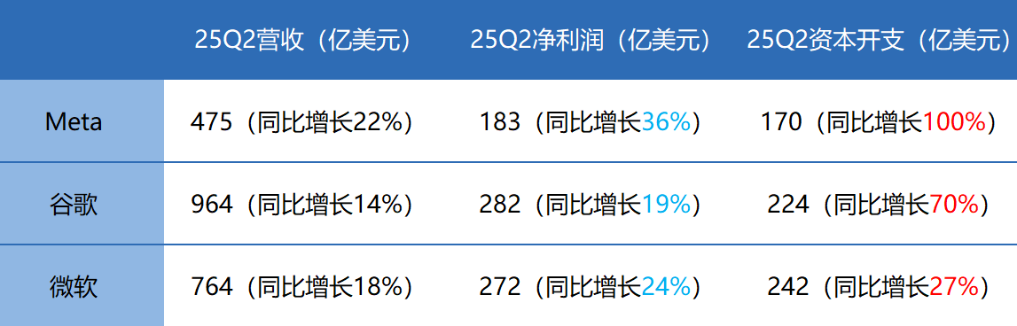 Meta、谷歌、微软的二季度资本开支分别同比翻倍、增长70%、增长27%,且三家都上调了未来支出预期。数据中心大建特建,利润端却难见覆盖投入的拐点。