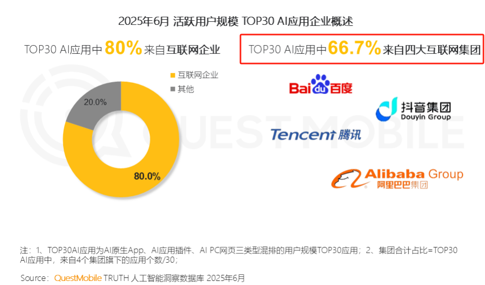 由于中美产业链价值与战略选择不同,中国科技巨头在这轮AI原生应用的竞争仍然保持相当的优势。根据QuestMobile数据,截至6月,国内TOP30的AI应用中,66.7%来自腾讯、阿里、抖音、百度四大互联网集团,国内科技巨头占据强势地位。上半年原生App整体复合增长率反映出市场已不存在“温和增长”的中间路线,中小应用的生存空间正被基础功能标准化及头部应用挤压。
