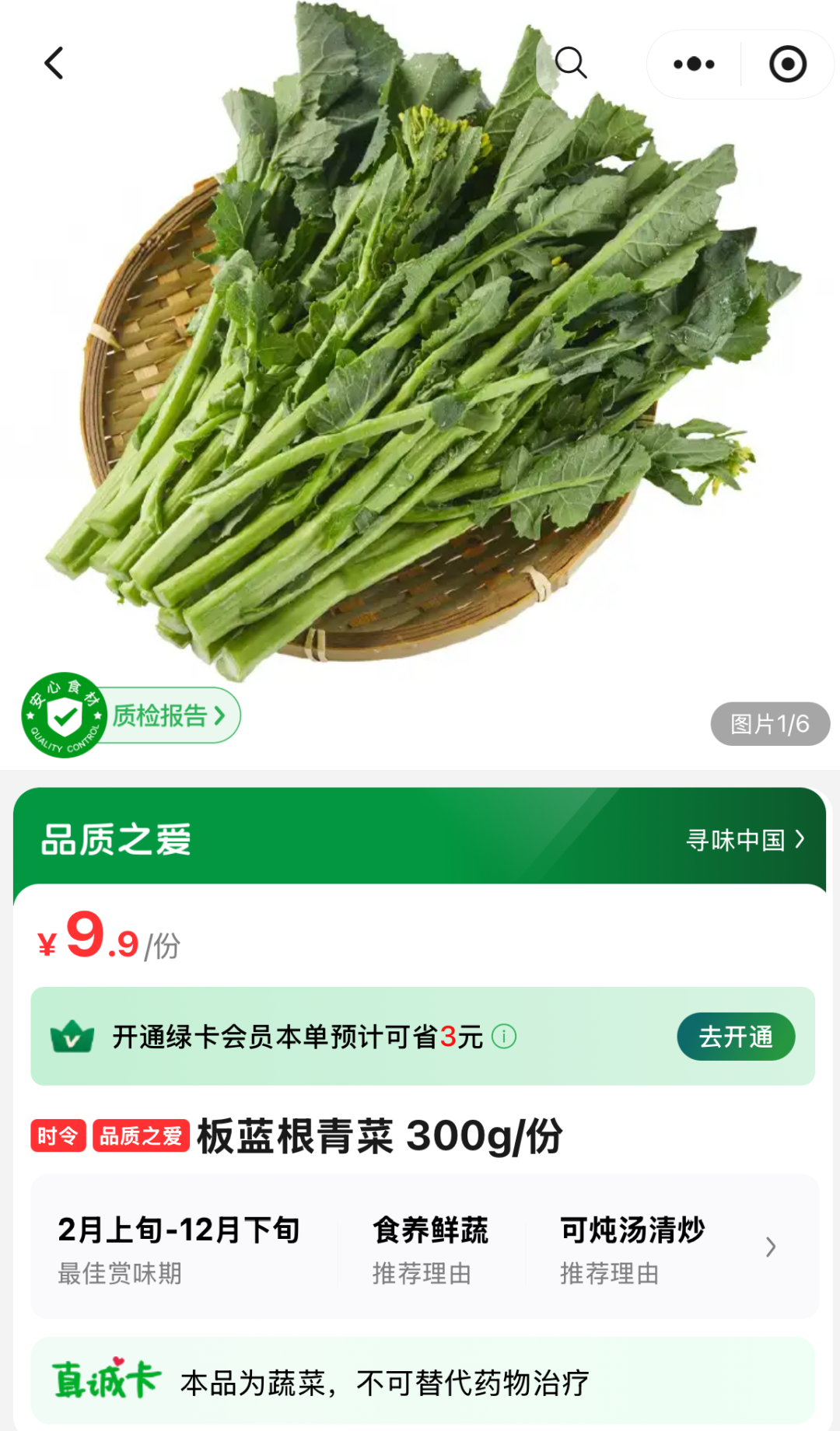 叮咚买菜小程序显示,300g的板蓝根青菜,售价达9.9元,相当于1斤要卖近20元。在产品介绍页面,叮咚买菜强调这款产品清甜爽脆不上火,含粗纤维、维生素含量高,适合清炒、白灼、涮火锅等。