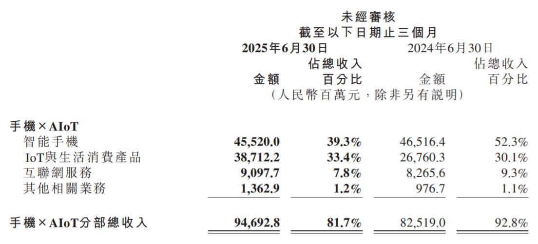 2025年第二季度,小米智能手机业务营收455.2亿元,同比下降2.1%,环比下降10.1%,占比也从今年Q1的45.5%缩小至39.3%。