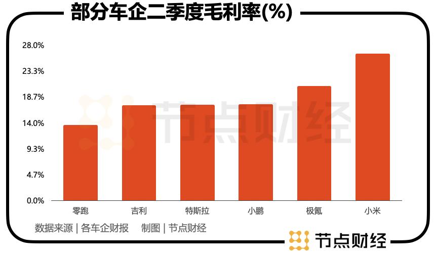 作为参考,2025年第二季度,极氪、小鹏、特斯拉、吉利、零跑的毛利率分别为20.6%、17.3%、17.2%、17.1%、13.6%。