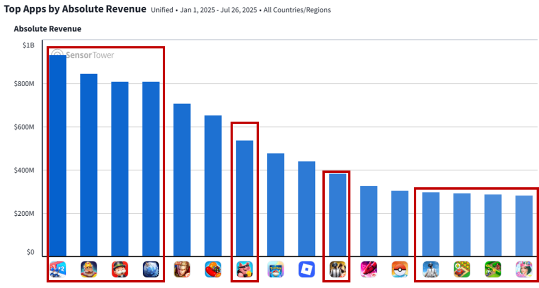 这些活动通常设置阶段性奖励,并提供大量游戏资源,激励玩家追求奖励,从而提升参与度和留存率。副玩法的引入显著丰富了游戏经济体系的「产出」与「消耗」,让原本经济深度有限、结构较浅、流失率高的休闲游戏拥有更多层次。值得注意的是,上述三款作品都是2025年收入前五的手游。