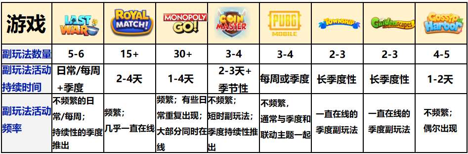 对某些作品而言,比如《Monopoly GO!》或《Royal Match》,副玩法已经成为运营活动的核心,且往往以主题化的周期性活动形式出现。对于《Last War: Survival》或《PUBG Mobile》这样的作品,副玩法则较为稀少,出现频率远低于前者。