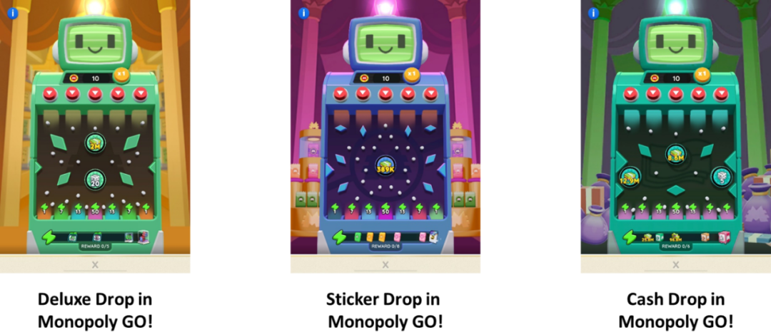 例如《Monopoly GO!》反复使用弹珠模版来推出「Peg-E Prize Drop」系列活动: