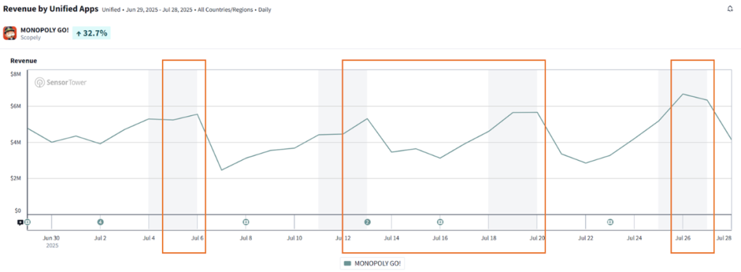 《MonopolyGO!》凭借高效的资产复用,可以并行运行多个小游戏,其收入曲线在小游戏上线期间会出现明显上升。