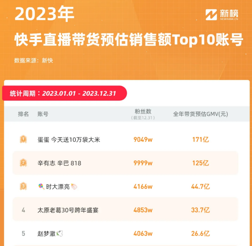 《2023谁在快手疯狂吸金:辛巴师徒蝉联带货Top3,22位主播跻身10亿GMV俱乐部》新榜