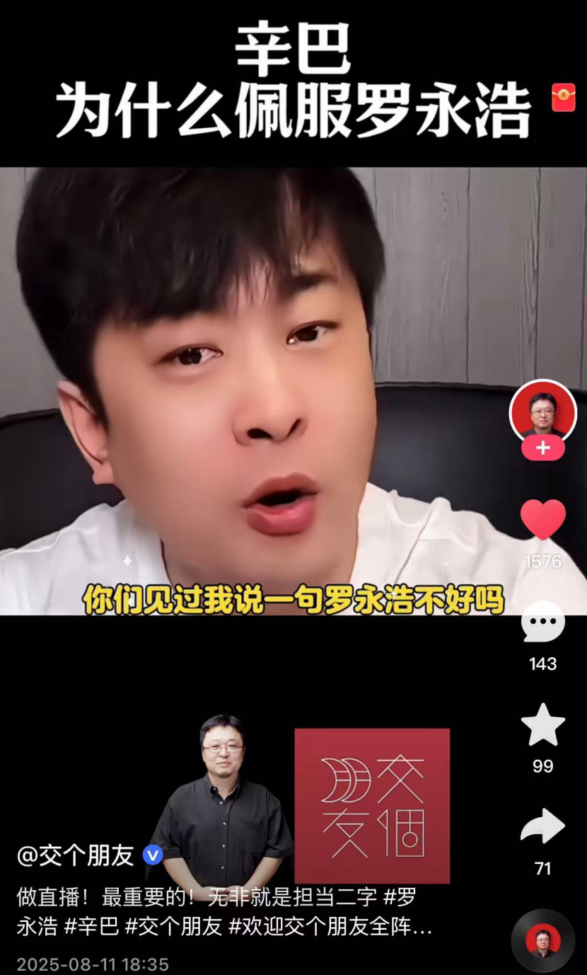 半个月前,交个朋友还发布了一条“辛巴为什么佩服罗永浩”的视频。视频里,辛巴说:你们见过我说一句罗永浩不好吗?这个人不管多难,他从来没做过有失男人、有失身份、有失公众人物的事。镜头一转,罗永浩讲起了自己在产品事故中的赔偿原则与担当。