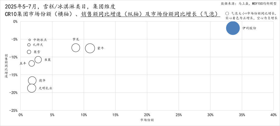 具体来看,伊利股份依然稳居首位,市场份额上升至约33%,领先优势进一步扩大,虽然其销售额同比也录得小幅下降,但相较于其他集团的跌幅,伊利的销售额同比表现依然在CR10集团中最好;蒙牛与梦龙(集团,前联合利华冰淇淋业务,已独立拆分)分别占据第二、第三的位置,市场份额位于10%左右,但两个集团的销售额同比增速均下滑约7%左右,份额也呈现出一定幅度的下滑。