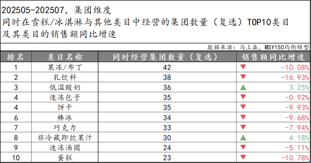 基于集团维度,马上赢拉取了在202505-202507时间段内,与雪糕冰淇淋类目有经营重合的集团数量的类目排名,可以看到,虽然消费大盘增长乏力是大家共同要面对的情况,但跨界而来的集团们,他们所在的类目也或多或少都面临着比大盘更严重的销售额同比下滑,其中果冻、乳饮料、蛋糕、饼干、棒冰、巧克力等,都是与近年来消费潮流与走向有一定背离的类目,这些类目中的集团或许跨界来到雪糕冰淇淋类目中的心情也更为急迫。