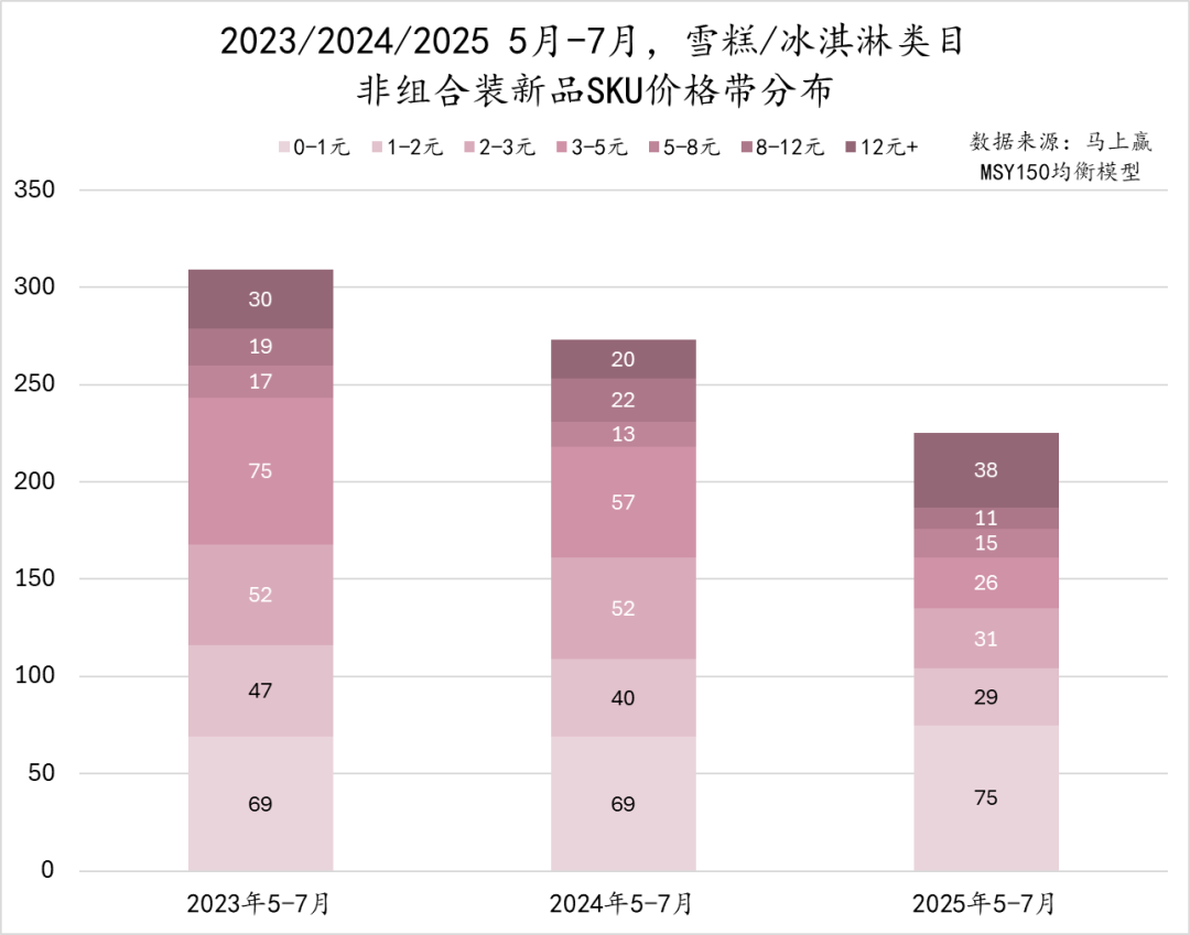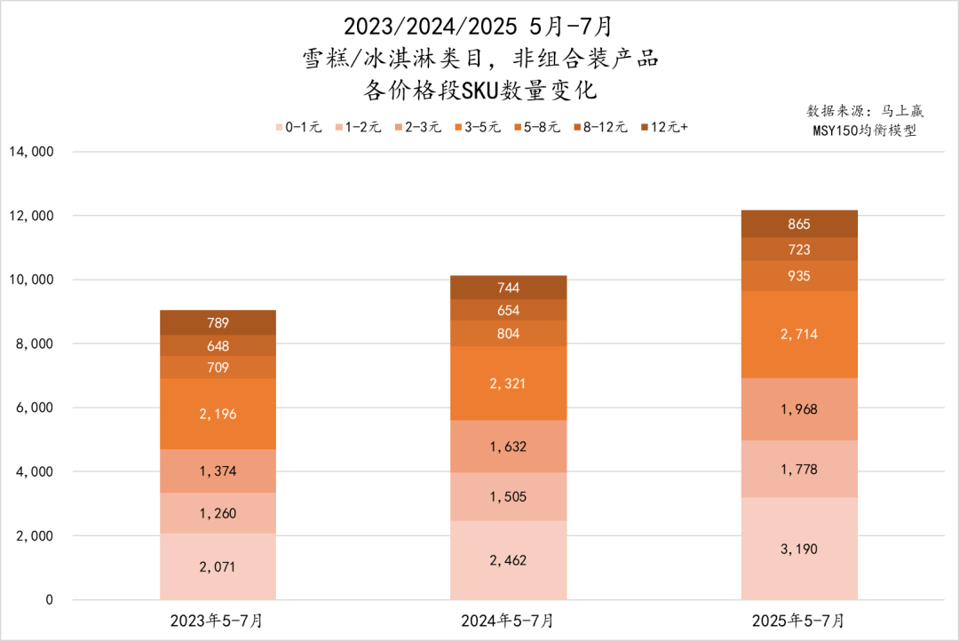 从各价格段 SKU 数量变化来看,雪糕/冰淇淋市场呈现出“低中价段 SKU 扩容,高价段增长缓慢”的特点。