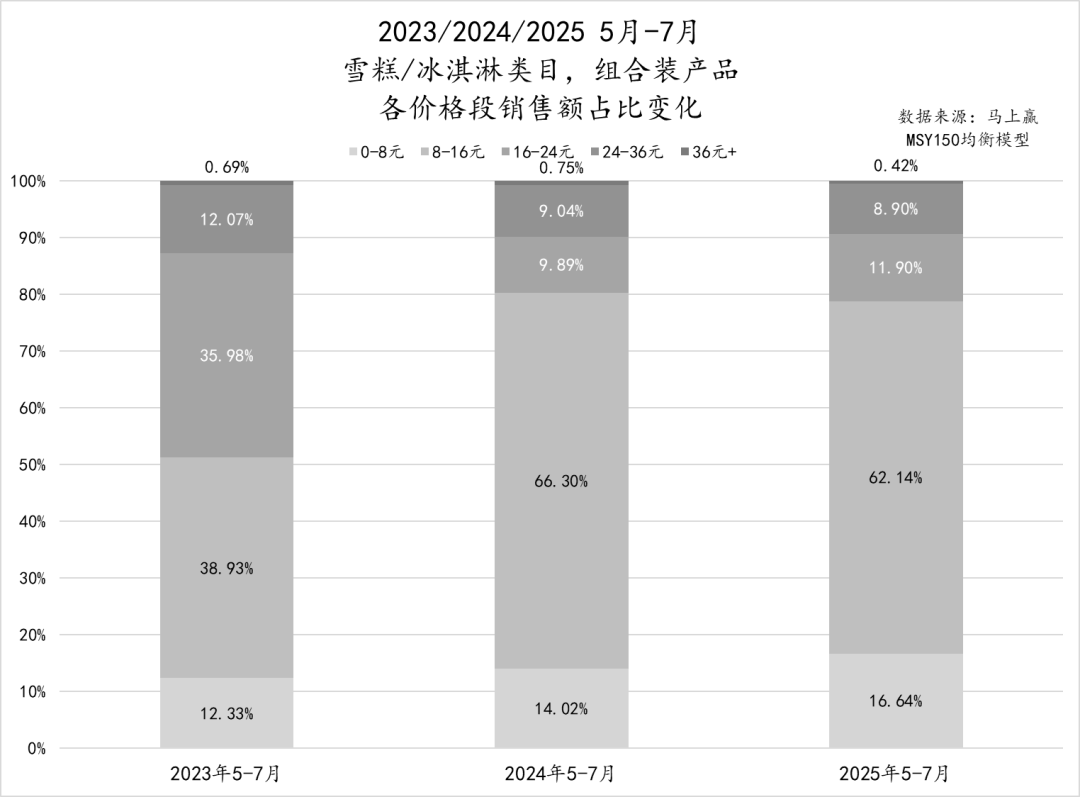 从雪糕/冰淇淋非组合装产品各价格段销售额占比来看,市场呈现明显的“低中价主导、高价收缩”趋势。