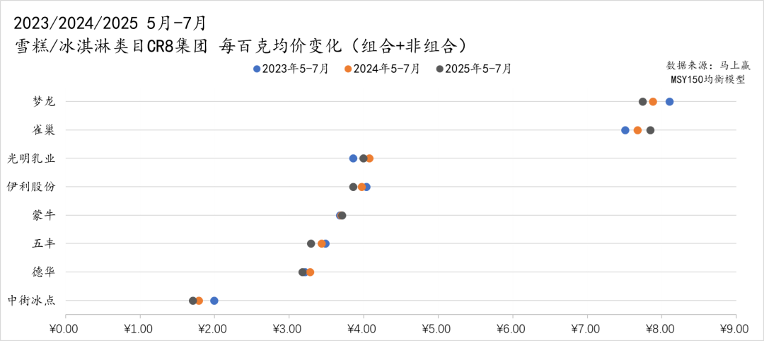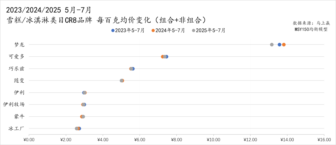 处于中段价格带的主要是巧乐兹和随变,两者的均价大致稳定在 5–6 元之间;在更低的价格带,伊利、伊利牧场、蒙牛和冰工厂则基本集中在 2–3 元之间,区间差别不大,三年来波动幅度也有限,价格端保持稳定。