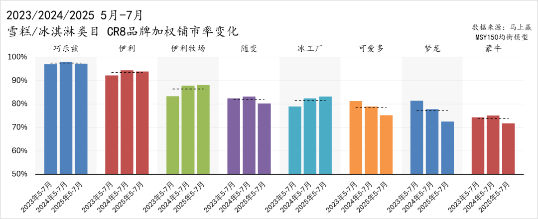 而在其他品牌中,蒙牛(品牌)和随变在 2024 年小幅上扬,但 2025 年明显回落;可爱多和梦龙则连续三年呈现下滑态势,从超过80%逐渐下滑至 75% 甚至更低。外资品牌在渠道上的收缩——主观上品牌出于发展考虑,一定不希望铺市率收窄,但在客观上,由于消费者产品选择、价格带偏好以及本土品牌竞争等因素,导致对于外资品牌来说有效、收益为正的网点数量可能客观上下滑了,最终反应出的结果是铺市率的下降。