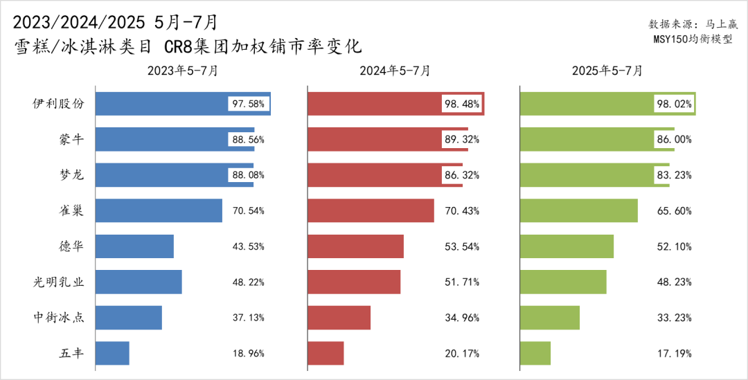 具体来看,巧乐兹和伊利(品牌)的加权铺市率始终维持在高位,三年观察期内都保持在约 95%;相比之下,伊利牧场和冰工厂的变化更具动能:伊利牧场从约 85% 稳步提升至接近 90%,冰工厂则从不足八成逐步提升至接近 85%,连续三年加权铺市率持续增长的同时,未来依然有进一步增长的空间。铺市率的提升对它们在市场份额和销售额上的同步增长功不可没——“买得到”是“卖得动”的前提。