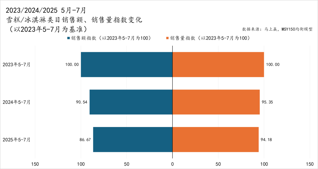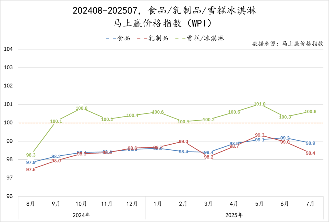 可以看到,从2024年8月至2025年7月,雪糕/冰淇淋走势表现突出。一方面,其指数自2024年9月以来均超过100,意味着相比自身,其类目价格水平一直处于同比正增长的状态当中,类目价格水平已经走出了前两年因“雪糕刺客”幻灭而导致的价格水平显著下滑;另一方面,与其上级类目乳制品,以及食品大类整体的价格指数相比,雪糕/冰淇淋类目的走势显著强于后两者,意味着其价格水平较大盘整体有着更好的表现。