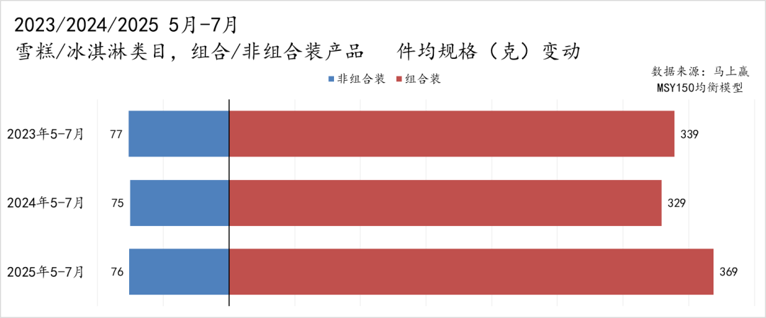 从件均规格变动来看,雪糕/冰淇淋市场在非组合装与组合装之间呈现出不同变化趋势。非组合装产品件均规格基本稳定,市场主流单品消费规格或已相对固化。相比之下,组合装产品的件均规格波动更为明显,2023 年为 339 克,2024 年下降至 329 克,2025 年又反弹至 369 克。整体来看,非组合装延续稳定格局,组合装则表现出更多的调整,在2025年组合装产品件均规格的上升,或也与进一步提升组合装产品性价比以增强其市场竞争力相关。