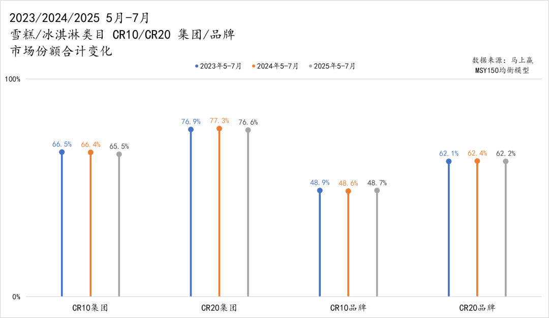 进一步观察类目集团/品牌的集中度情况,可以看到,在 2023–2025年5-7月期间,雪糕/冰淇淋类目的集中度整体保持相对稳定。集团层面,CR10集团的类目内市场份额从 2023 年的 66.5% 小幅下滑至 2025 年的 65.5%,而 CR20 则基本维持在 77% 左右,头部集团的市场份额略有削弱,但中腰部集团及时补位,整体变化不大。