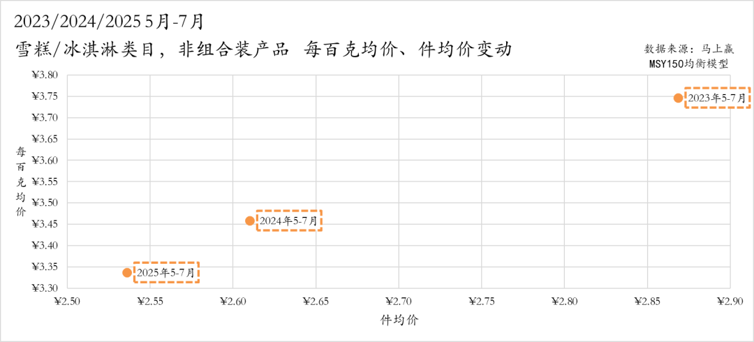 非组合装产品价格走势方面,雪糕/冰淇淋类目非组合装产品每百克均价和件均价都呈现逐年下降趋势。每百克均价从 2023 年约 3.75 元下降至 2025 年的 3.35 元,件均价从 2.9 元降至 2.55 元,同样承压较为明显。非组合装作为市场主流,件均价下降幅度相对平缓,且2025/2024相比2024/2023,其件均价、每百克均价下降幅度均有收窄,或同样体现出消费者的需求降级正在筑底阶段,趋于稳定。