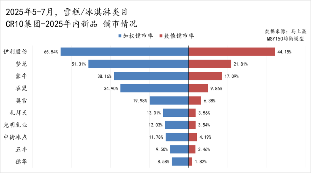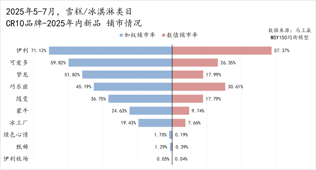 值得关注的是可爱多和梦龙的表现。两者在新品上的加权铺市率(可爱多约 60%、梦龙约 52%)明显高于数值铺市率(分别为 26% 和 18%),排名顺序也更靠前。这意味着它们的新品虽然铺货点位数量相对有限,但铺货质量很高,多集中于高效、销售能力强的点位当中,与两个品牌自身较高的定位与定价适配。
