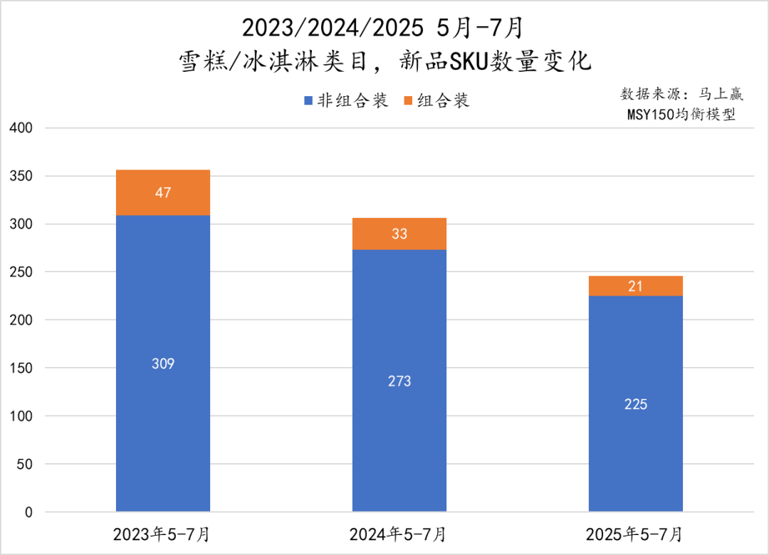 从三个观察期内雪糕/冰淇淋类目的新品SKU数量变化来看,即便该时间段已经处于旺季,产品上新数量已在下滑时间段当中,但依然可以看到逐年减少的趋势。其中,非组合装始终占大多数,但数量从 309 个降至 225 个,组合装新品则从 47 个减少至 21 个,收缩幅度更大。